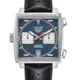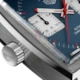 The groundbreaking design elements are all in place: blue dial with horizontal steel indexes, silver sub-dials for chronograph minutes and chronograph hours, date at 6 o’clock, and a red chronograph hand to give it a racing touch.